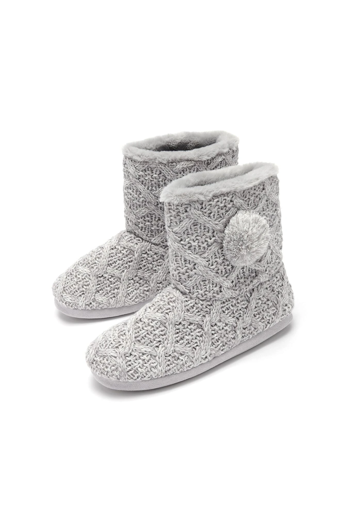 Get ready to relax in these Cable Knit Bootie Slippers. With a cosy sherpa inner, these luxurious cable knit slippers are inspired by the bestselling Cosy Cable Knit Sock. A real treat for your feet, these knit bootie slippers with pom pom trim are perfect for relaxing.