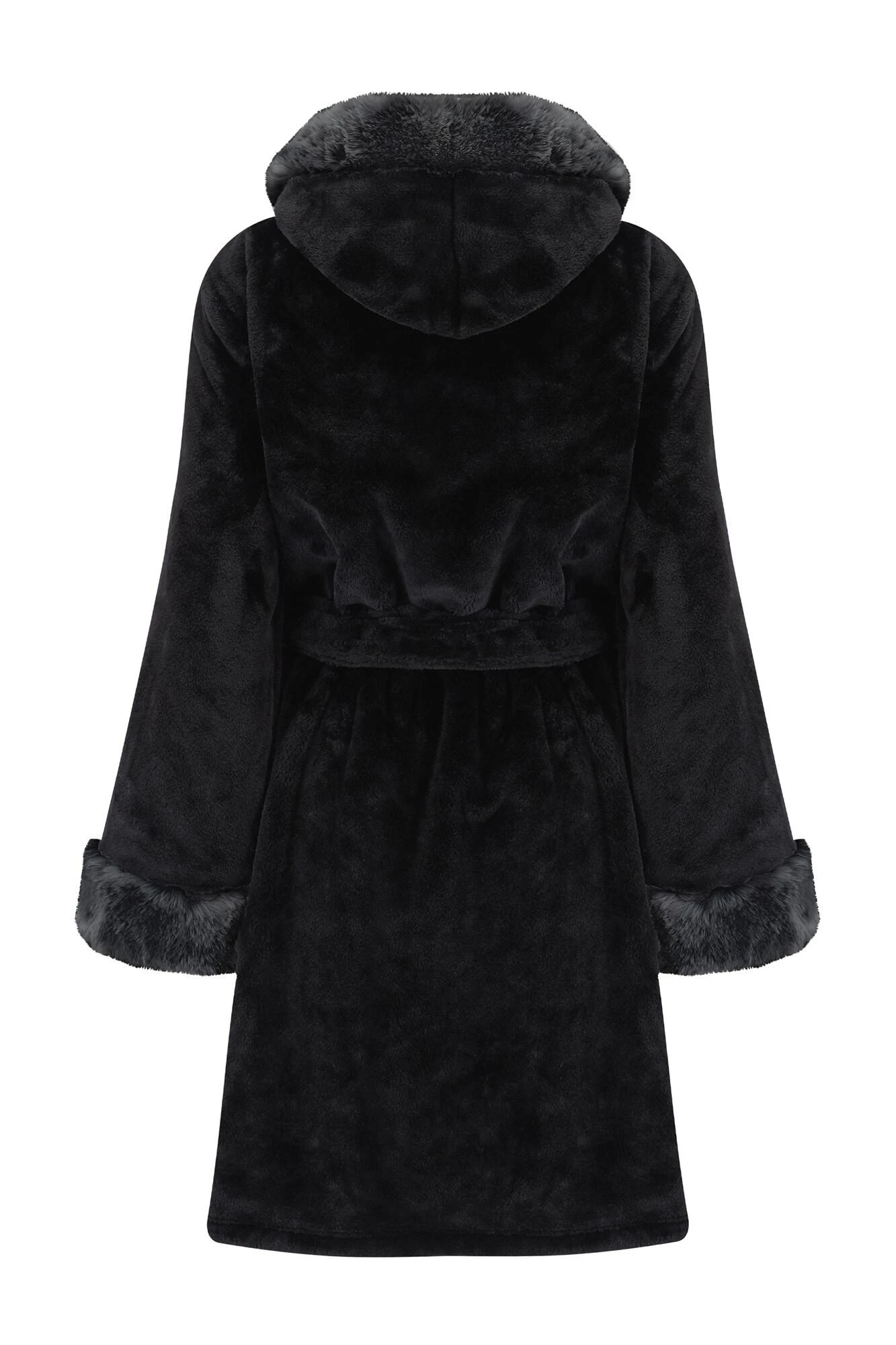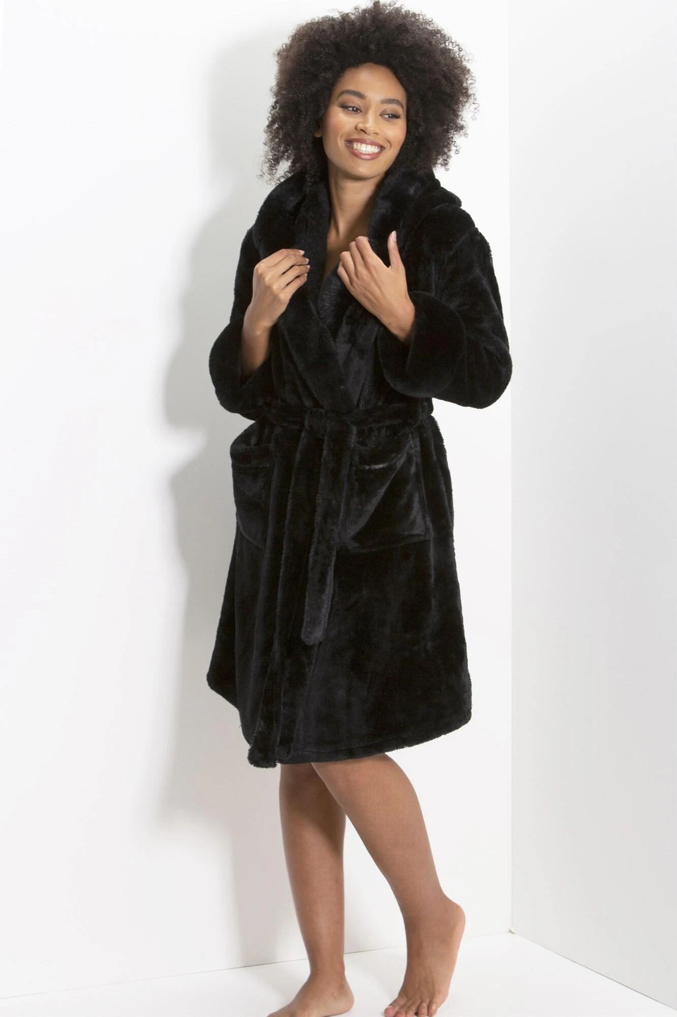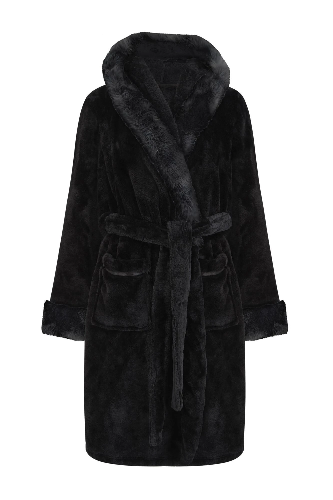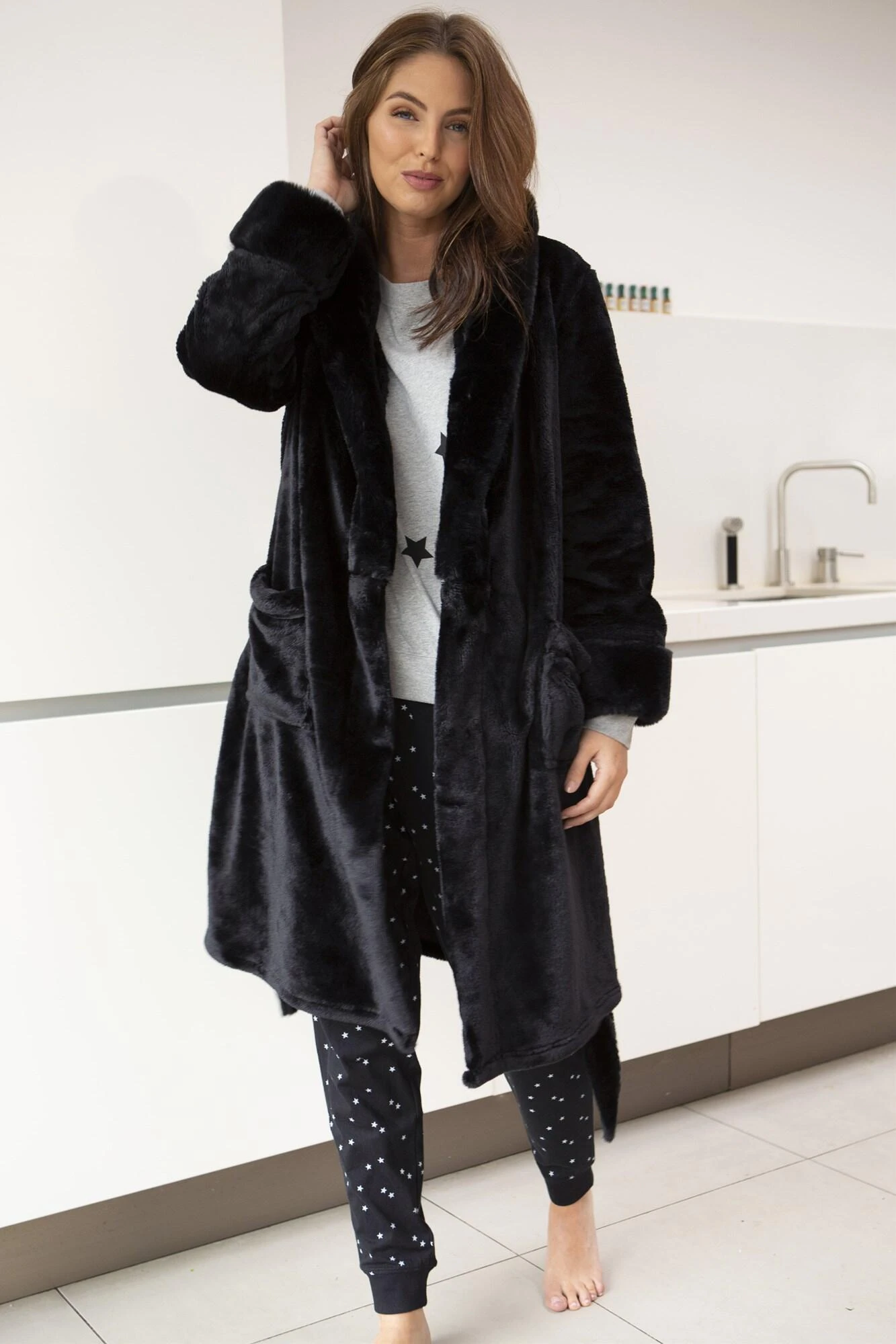 Love a classic dressing gown? This one really ups the style and comfort factor. With a cosy hood that has a fluffy faux fur trim you’ll feel super glamorous, while the deluxe fleece fabric will encase you in snuggly luxury from top to toe. Match with anything from our nightwear collection and a pair of black slider slippers.