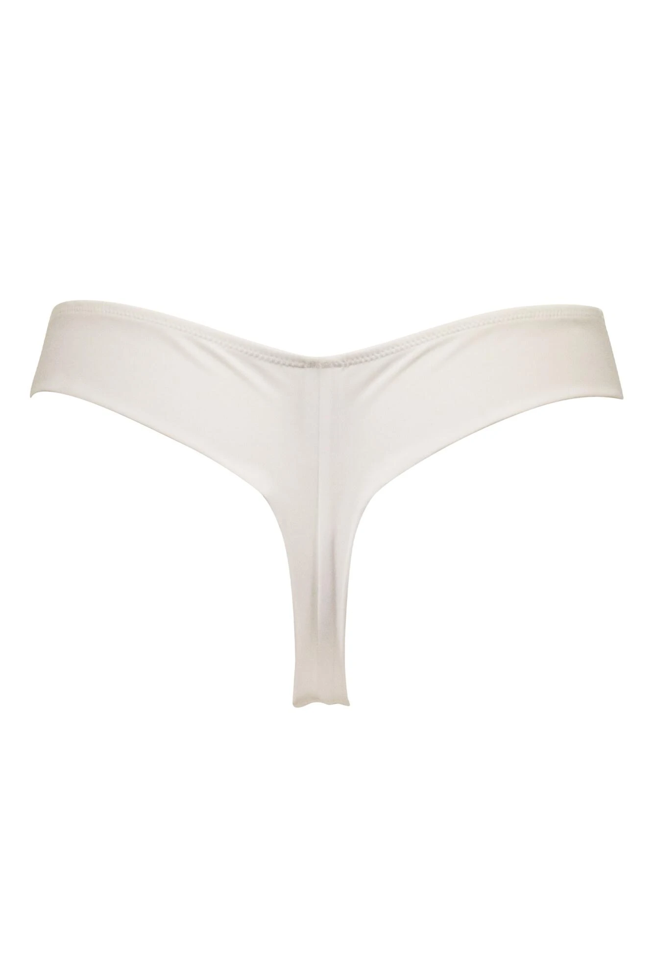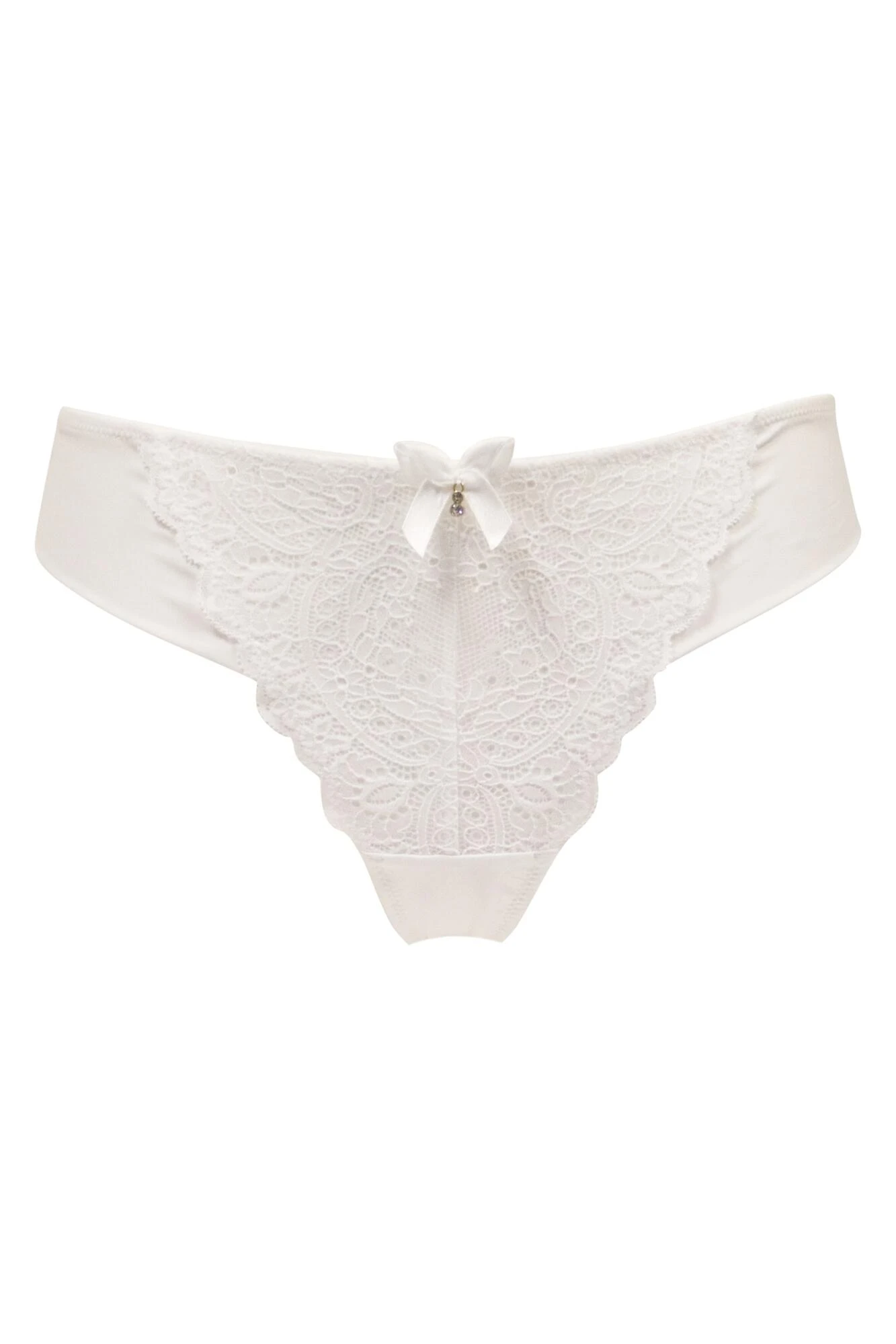 Looking for the perfect white thong? Look no further than the classic Divine Thong with a pretty lace front panel and adorable bow and jewel detailing. Create a divine look for any special occasion with a matching bra from the collection.