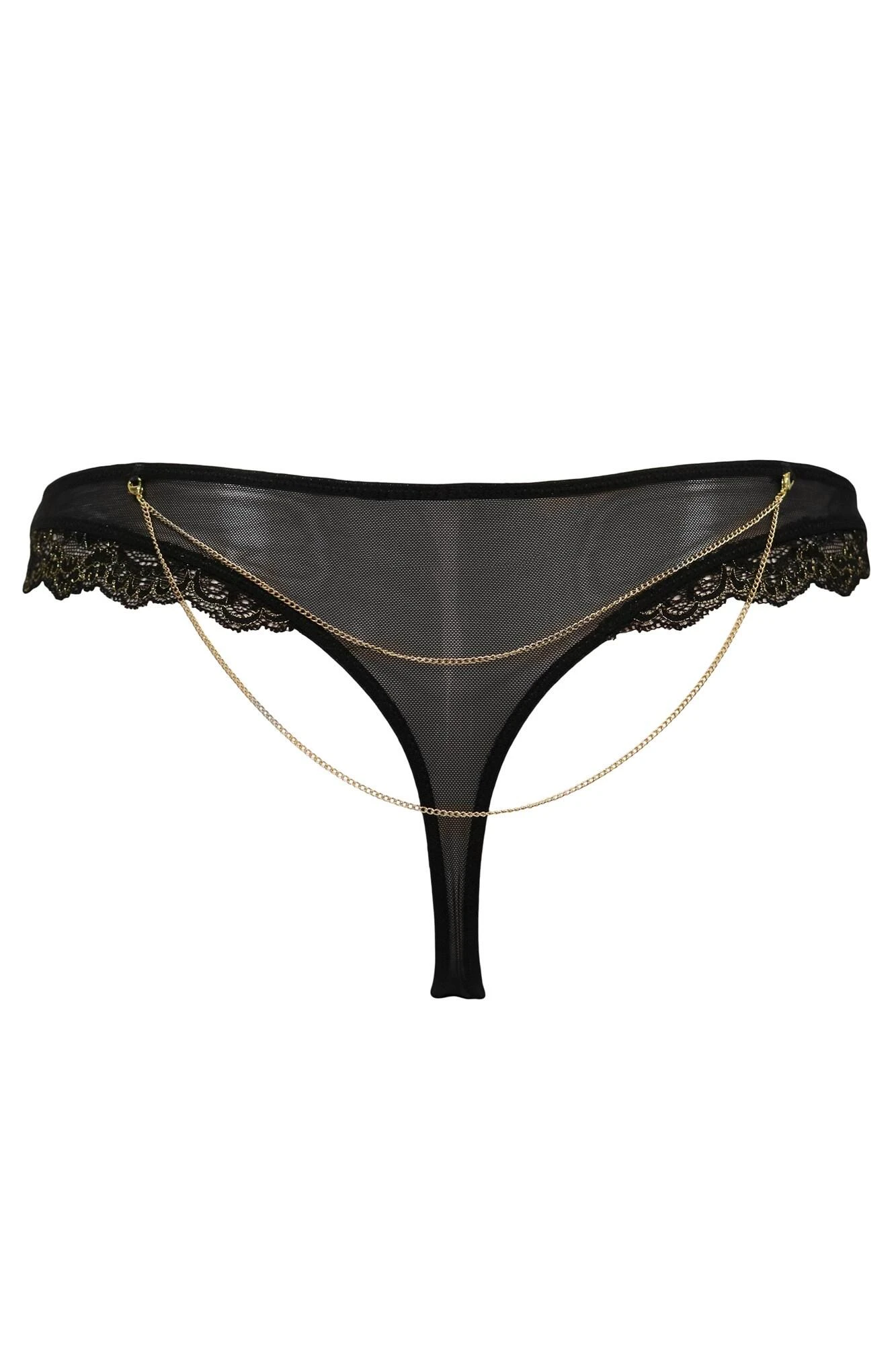 Your underwear says a lot about you. Feel ultra glam in this gold thong adorned in metallic floral lace. With satin side panels and irresistible detailing such as removable chains and gold hardware you’ll never want take these off. Add a touch of luxe to your underwear drawer with our matching bras from the Laced in Gold range.