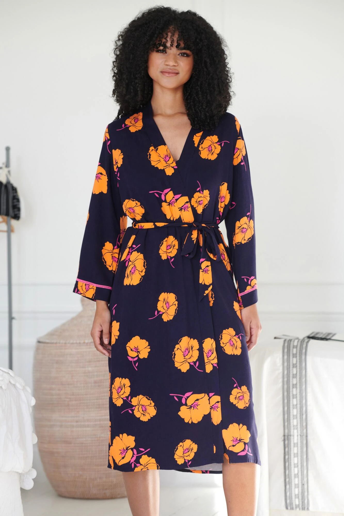 Get luxurious nightwear all wrapped up with this beautiful dressing gown. Float around the house looking fresh and elegant in the Vienna print, which beautifully combines muted navy with feminine pink florals. Made of a luxe woven twill fabric, match with the Vienna chemise and leave the waist tie undone to show it off.Â