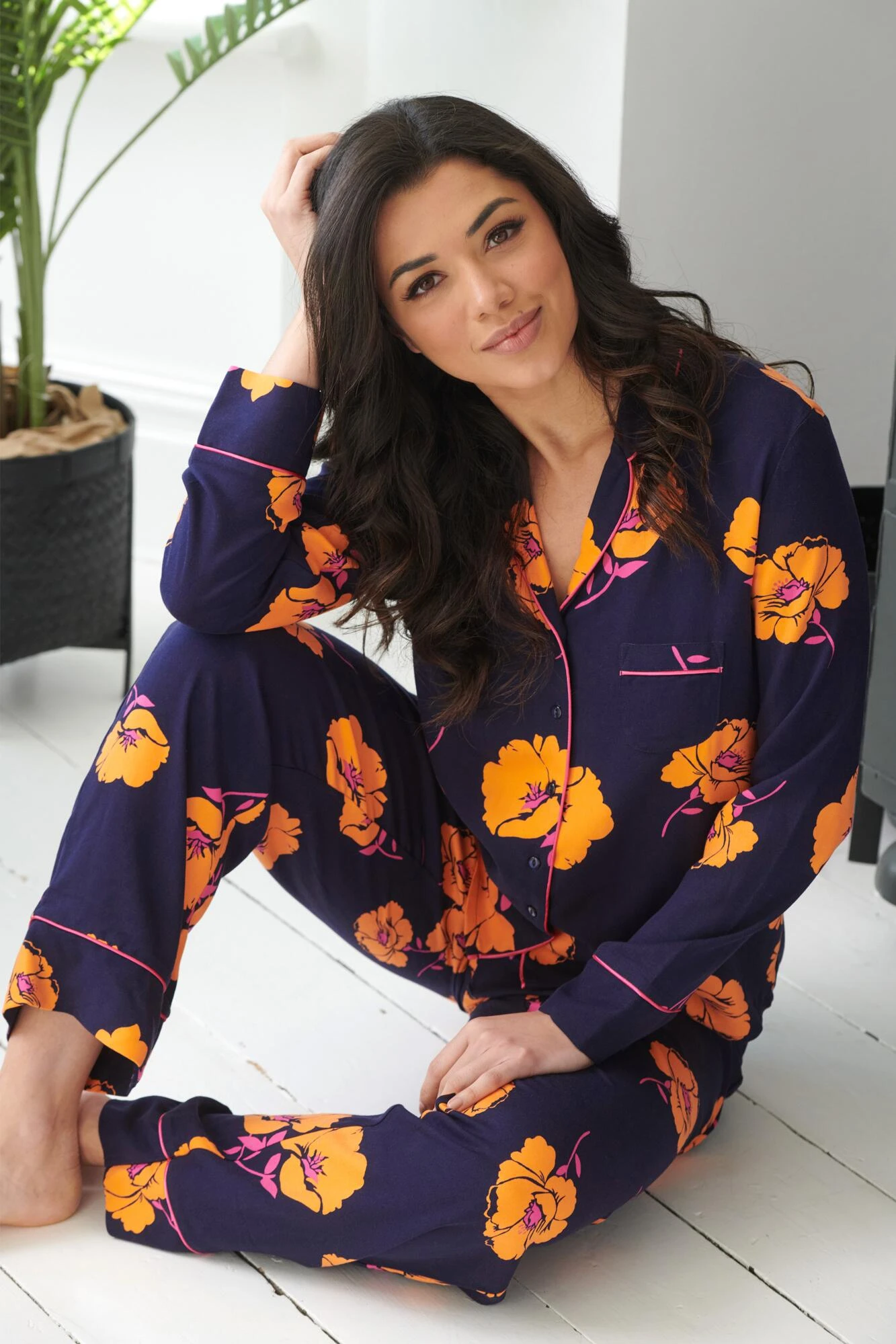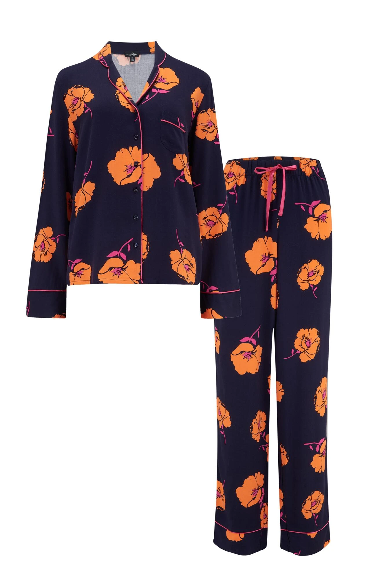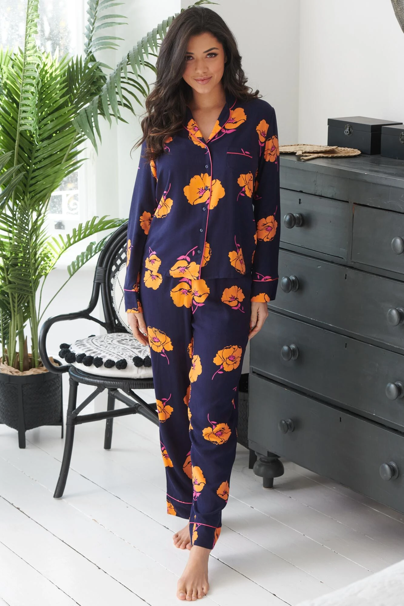 Add some luxury to your nightwear collection with these gorgeous pyjamas. Fresh and elegant these beautiful, printed pyjamas made with slinky fabric feels sensual against your skin. With a classic button-up top and flowing pyjama bottoms, match with the Luxe Woven Twill Longline Gown for a match made in nightwear heaven.