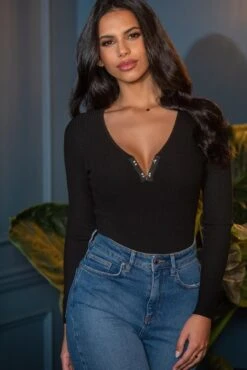 Pour Moi Layla Rib Knit V-Neck Bodycon Mini Dress With LENZING™ ECOVERO™ Viscose – Black